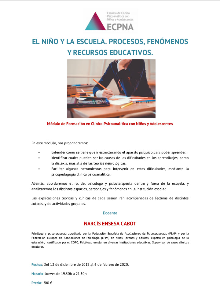 En aquest curs, de sis sessions, abordarem àmpliament l'engranatge del nen- alumne amb els aprenentatges, l'escola i els personatges que hi intervenen. Aprofundirem en les causes emocionals de per què un aprenen presenta dificultats escolars i d'aprenentatge i donarem recursos psicoterapèutics per saber com abordar-les. Les dificultats en la lecto-escriptura com ara la dislèxia, tindran una atenció especial. A més, analitzarem el rol del psicòleg dins i fora de la institució escolar.